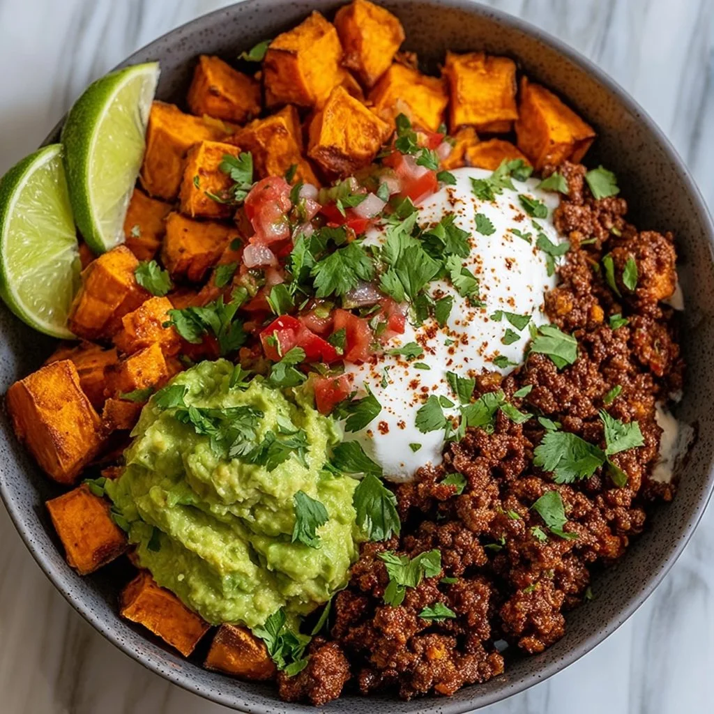 A comforting sweet potato taco bowl with roasted sweet potatoes, seasoned meat, and colorful toppings.