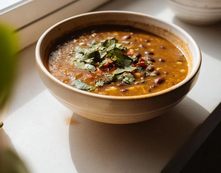 A comforting, slow-cooked vegan soup featuring black beans and spices for a flavorful meal that is easy to reheat and perfect for batch cooking.