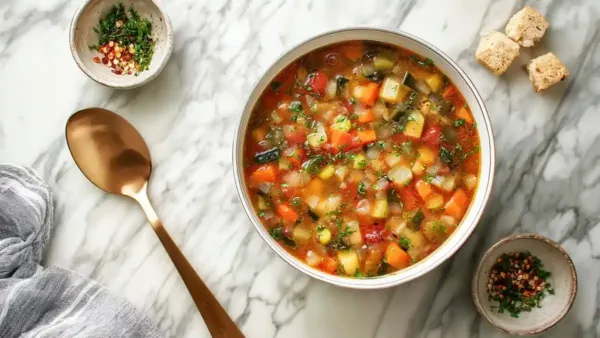 Rustic vegetable soup with diced carrots, zucchini, and herbs served on a marble background