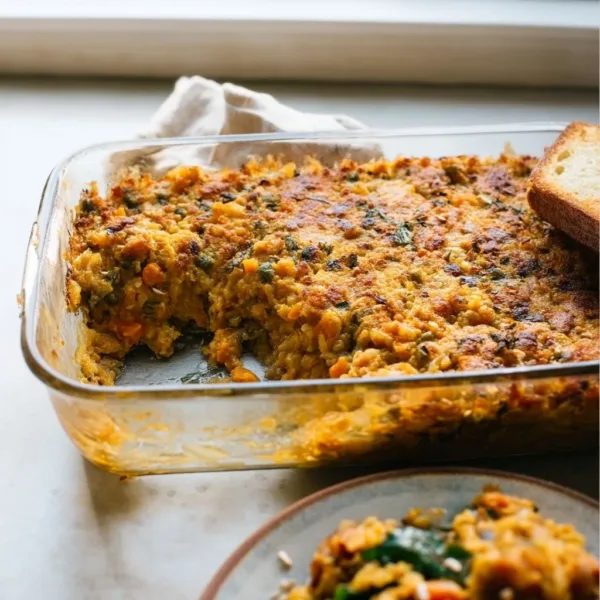 A comforting meatless casserole with lentils and sautéed vegetables, baked to perfection for a soft, creamy interior and tender bites.